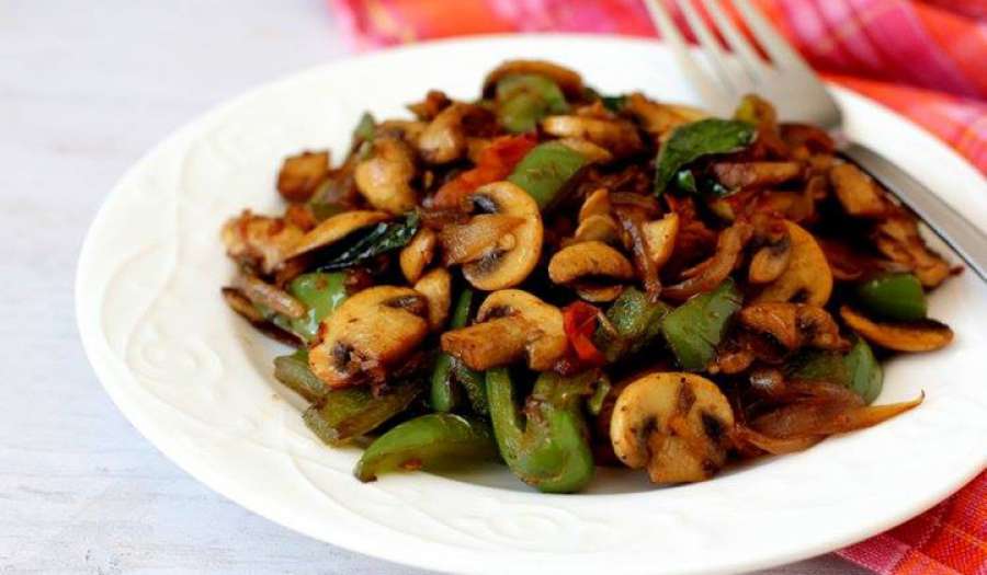 სანამ სოკო კარგად მოიშუშება, მანამდე დავაყაროთ ალყა-ალყა დაჭრილი ხახვი, წვრილ გრძელ ნაწილებად დაჭრილი ბულგარულები, წვრილად დაჭრილი ცხარე წიწაკა, ჩავაჭყლიტოთ ნიორი და განვაგრძოთ შუშვა მანამდე , სანამ სოკო კარგად არ დაიბრაწება.