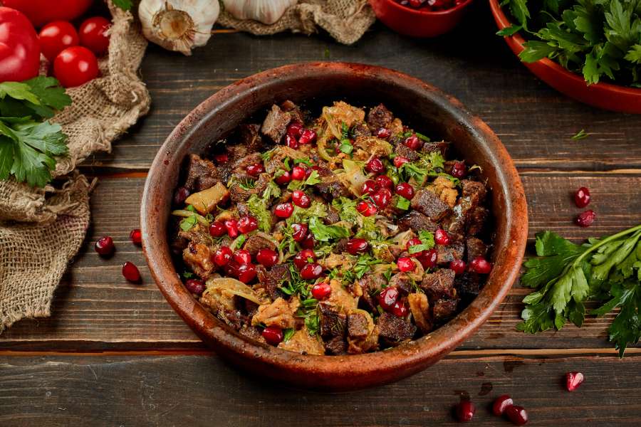 ამასობაში თხლად დაჭერით მწვანე ქინძი და მოაყარეთ მომზადებულ კუჭმაჭს. გააფორმეთ ბროწეულის მარცვლებით და გემრიელად მიირთვით!